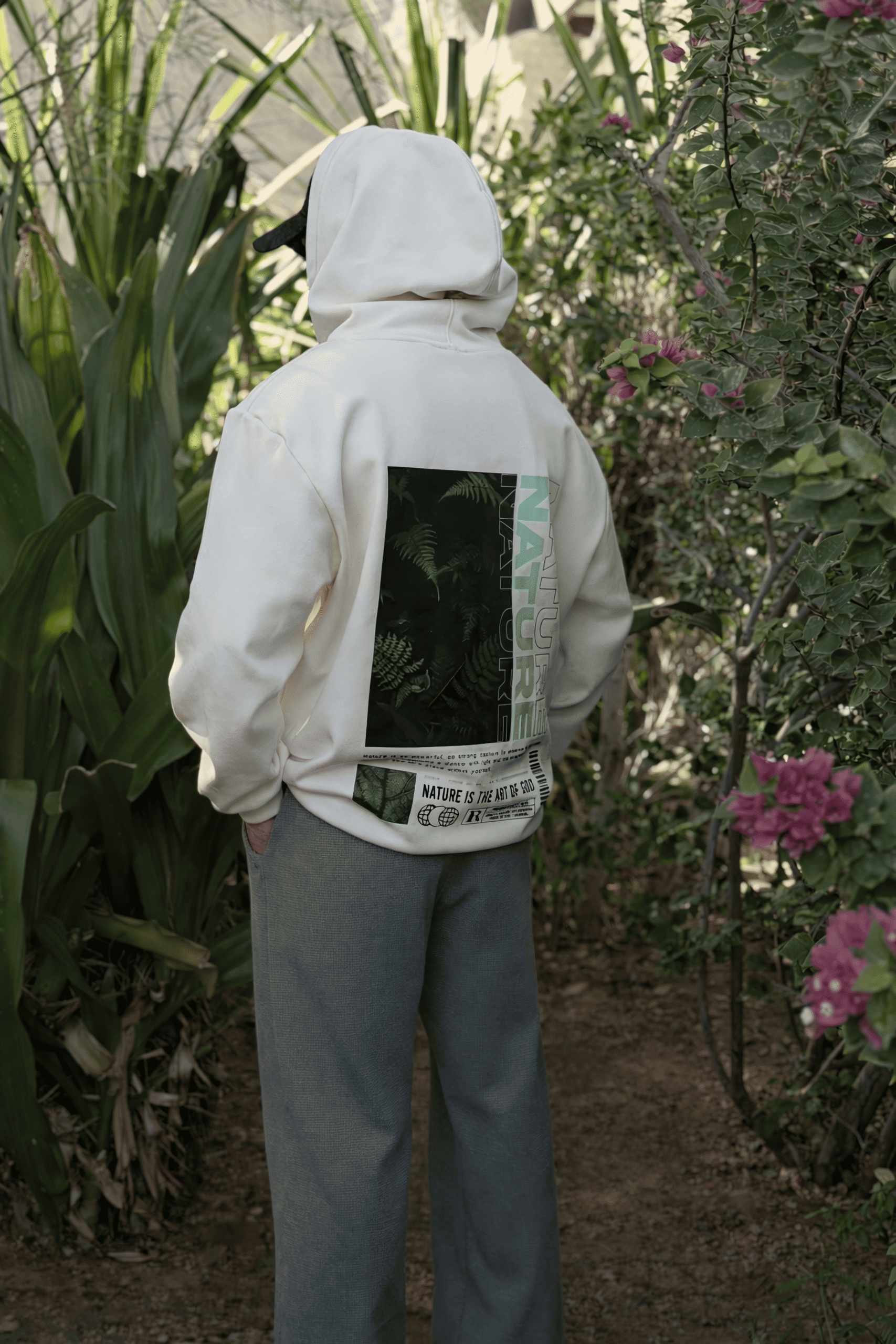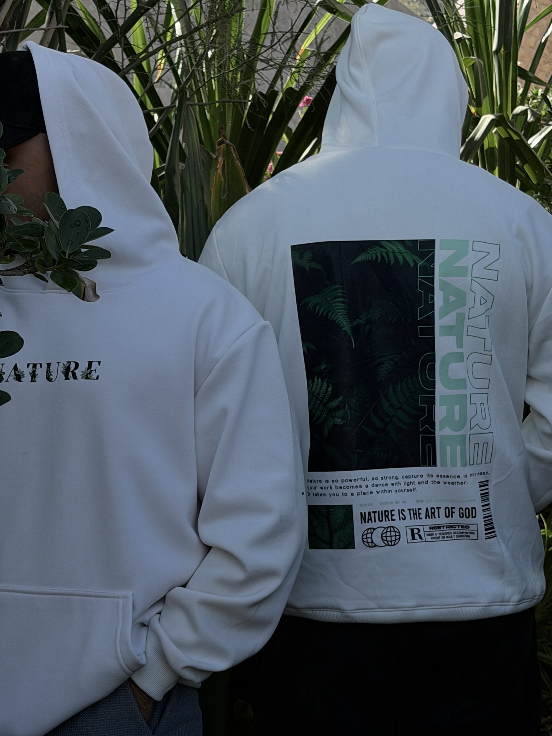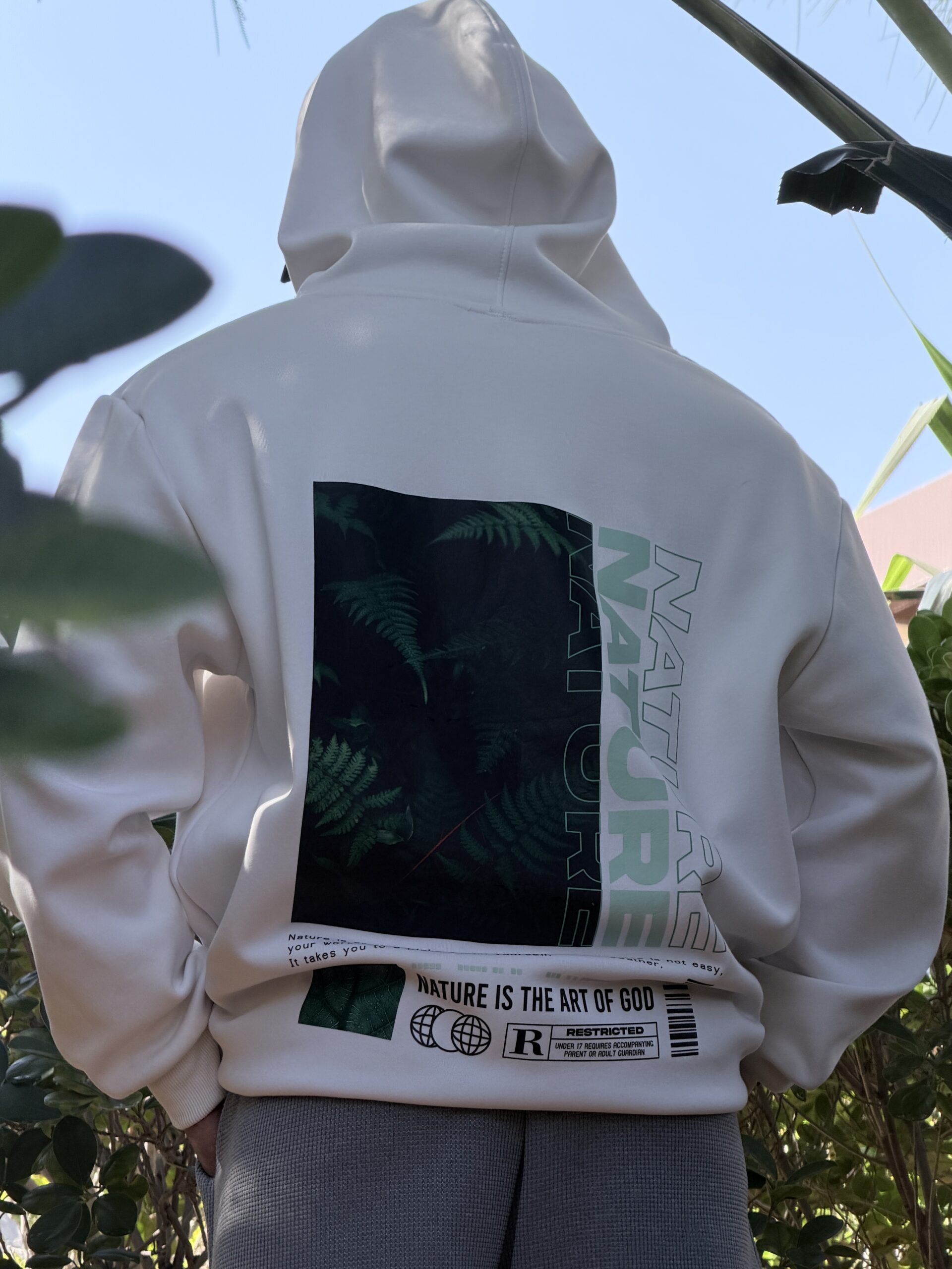 Crafted for those who seek the profound quietude of untouched places, this piece carries the soul of the wilderness within its very fibers. On the front, a subtle “NATURE” emblem—a quiet declaration. Across the back, a masterfully rendered fernscape unfolds, each frond a testament to nature’s patient artistry.
